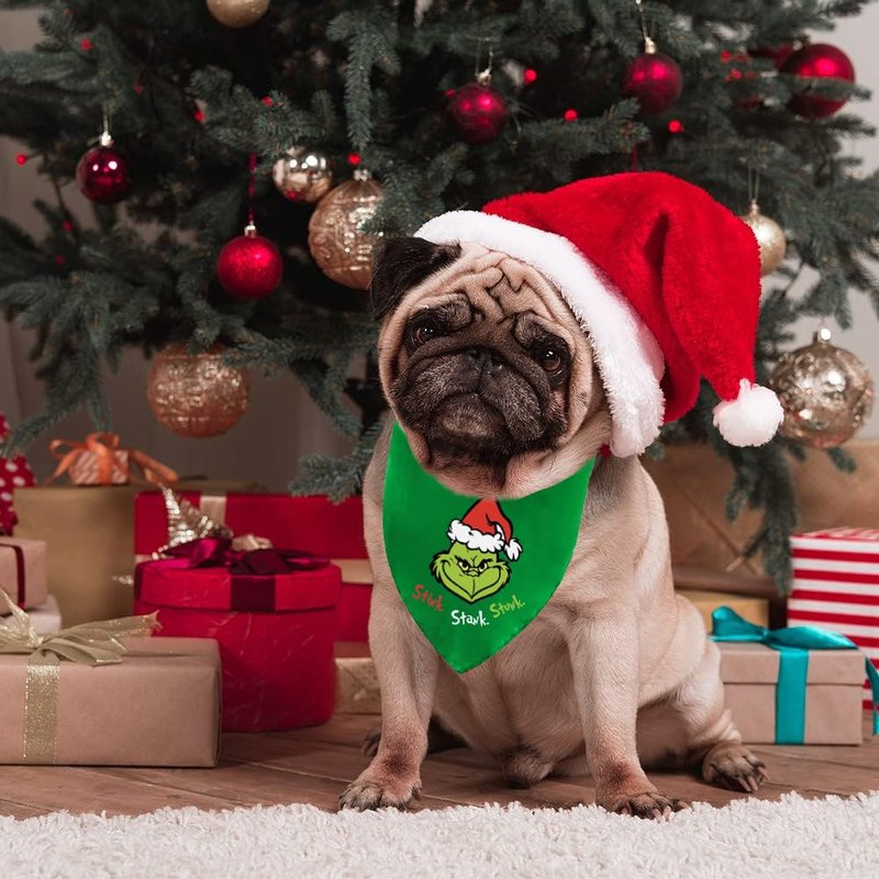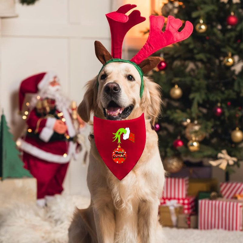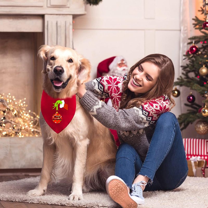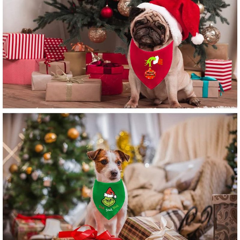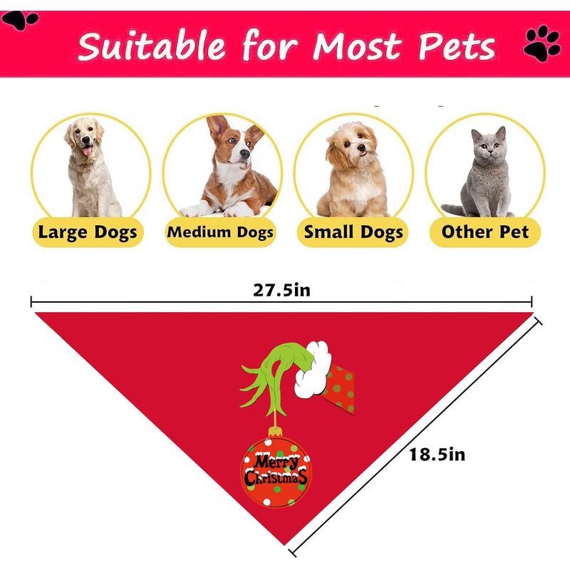 - CHRISTMAS DESIGN: Dog bandanas are designed with "Merry Grichmas", Classic Christmas colors - red with grich hands, green with grich face, Make your pet show a different appearance, Look more cute and charming, Will be praised by family, friends and neighbors.