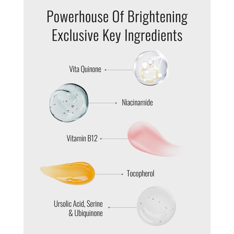 - POWERFUL INGREDIENTS - Formulated with Vita Quinone as the key ingredient, containing niacinamide, vitamin B12, tocopherol, ursolic acid, serine, and ubiquinone for both invisible internal blemish relief and visible surface blemish reduction, along with skin tone enhancement.