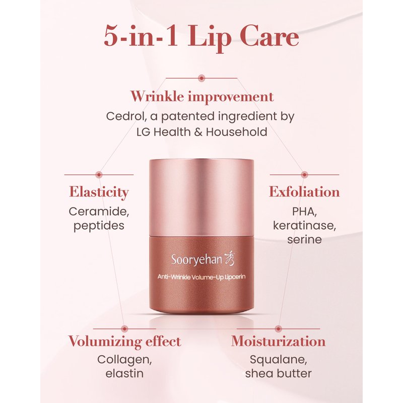 - 5-IN-1 LIP SOLUTION - Experience the ultimate lip transformation with Sooryehan Lipcerin's exclusive Penta Turnover Recovery Complex. This advanced lip care product offers a comprehensive solution to enhance your lips, focusing on five key benefits: gentle exfoliation of chapped lips, reducing the appearance of fine lines, providing deep moisturization, improving elasticity, and delivering a glossy finish.