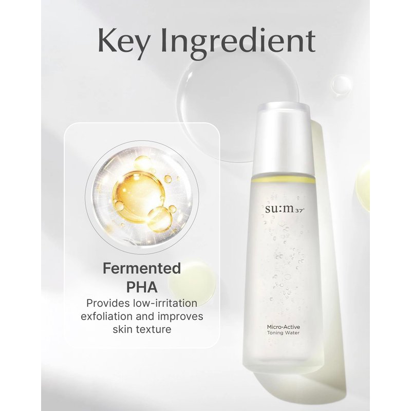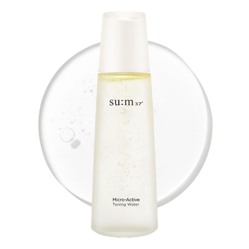 - SU:M MICRO-ACTIVE TONING WATER (5.07 fl oz) - This toner features a unique dual-phase liquid with a colorless water layer and a yellowish oil layer, providing comprehensive care by combining gentle exfoliation with deep nourishment. The innovative formula effectively removes surface impurities while enhancing your skin's natural radiance.