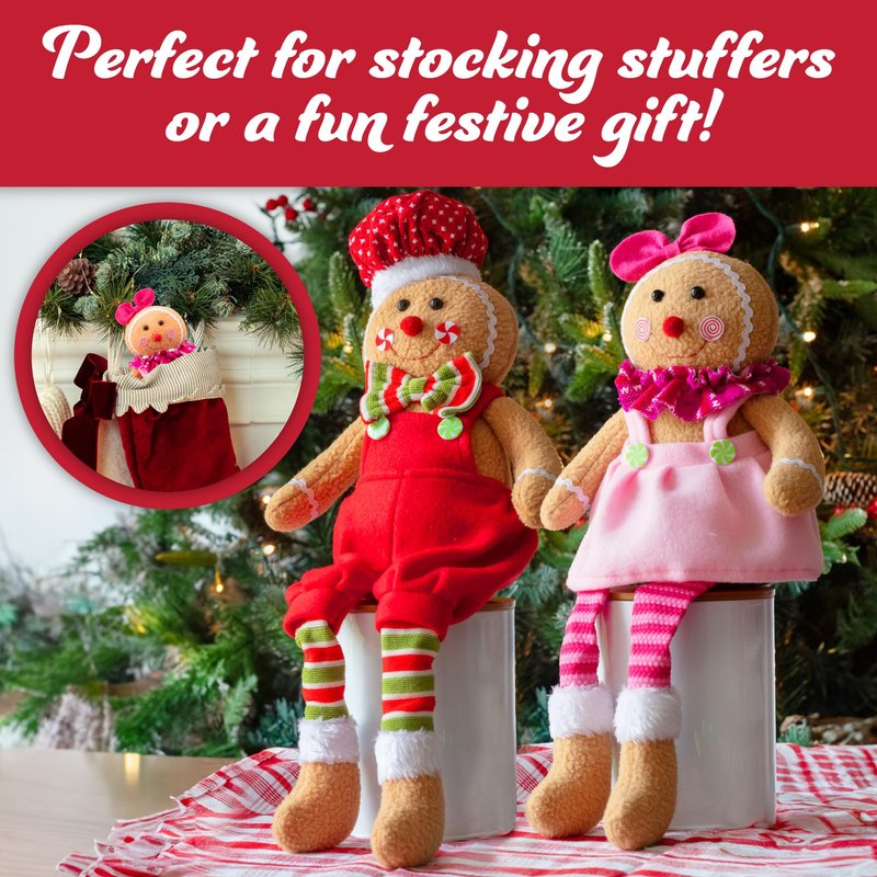 Christmas Gingerbread Plush Dolls, Set of 2 - 17" Boy & Girl Cute Shelf Decorations - Fun Kids Holiday Toy Elf Buddy, Tree, or Stocking Stuffer w Festive Santa Outfits, Mantel Decor, Gift for Xmas