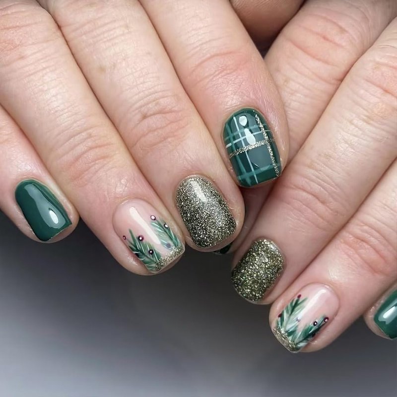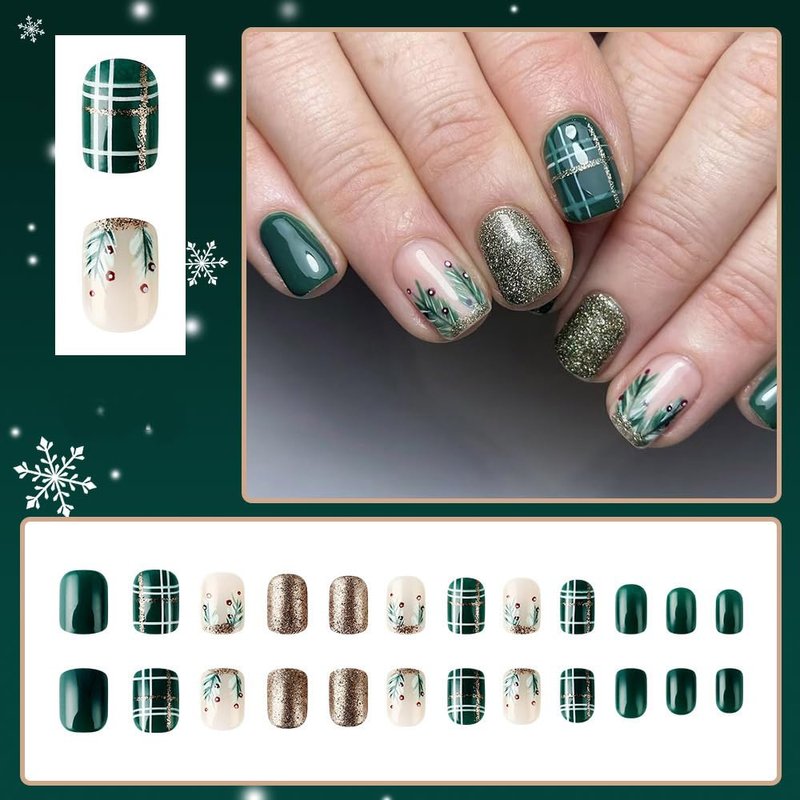 Christmas Green Press on Nails Short Square Acrylic Nails Press on Winter Fake Nails with Gold Glitter Stripes Designs Full Cover Glue on Nails Xmas Glossy Artificial False Nails for Women 24Pcs