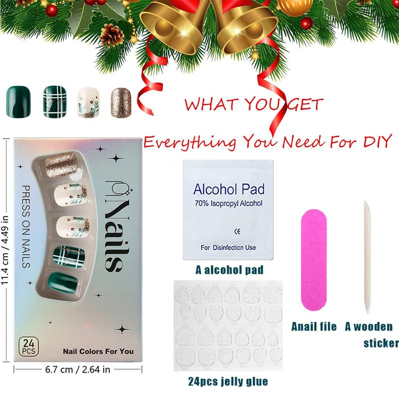 - 【Complete Christmas Nail Kit】:This Christmas glossy fake nail set includes 24 pieces of false nails (12 sizes). Along with that, it has 1 sheet of 24-grain jelly glue, 1 nail file, 1 wooden stick, and 1 alcohol cotton