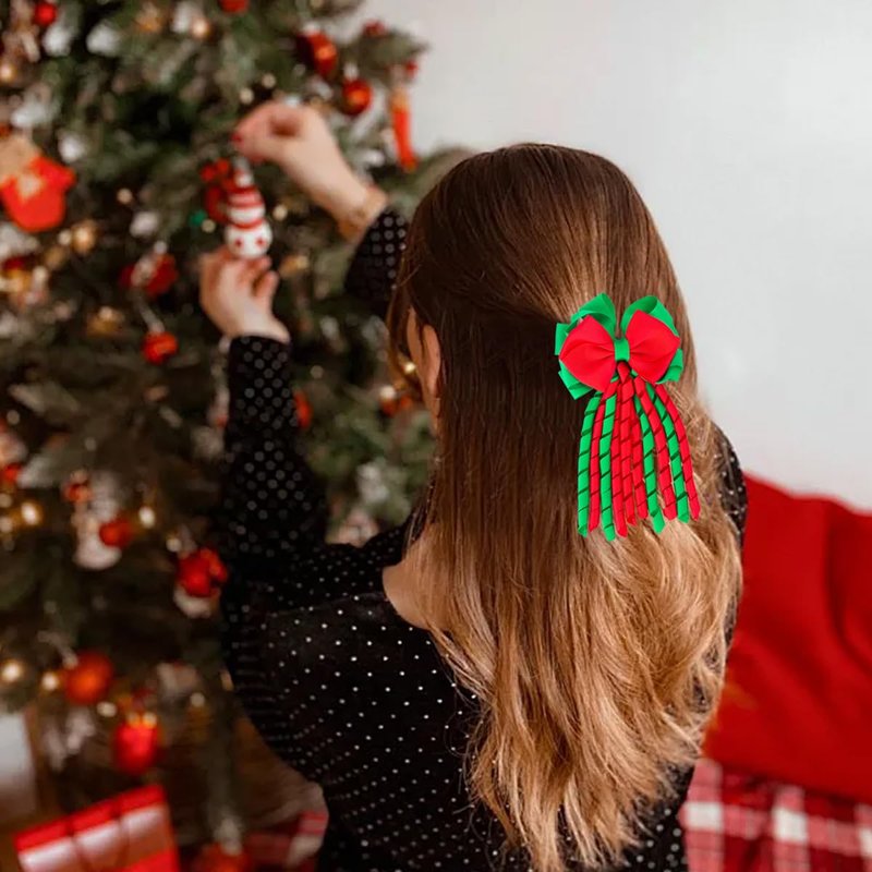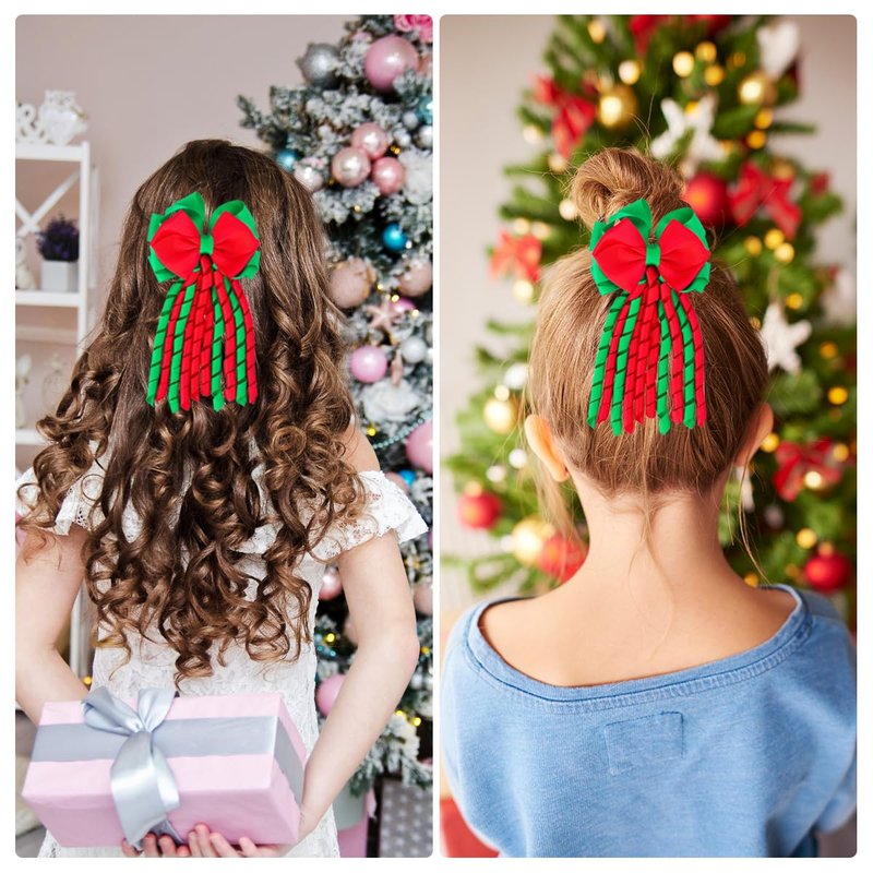 - 🎄 Christmas Themed Design: Elevate your holiday style with our 6.5-inch Christmas hair bows! Featuring playful curly ribbon tassels in vibrant red and green, these bows add a cheerful touch to your festive look, perfectly capturing the spirit of Christmas.