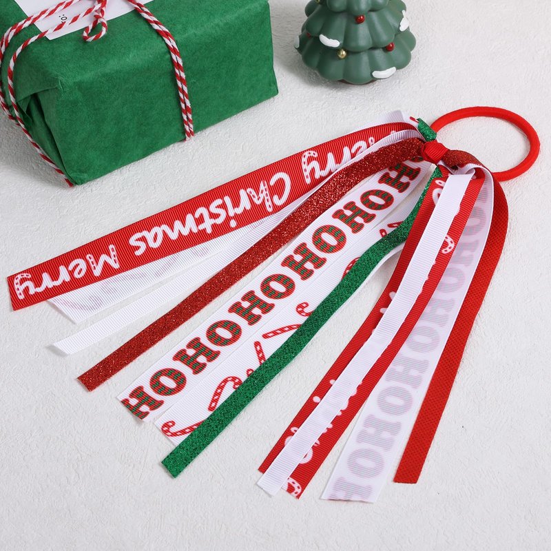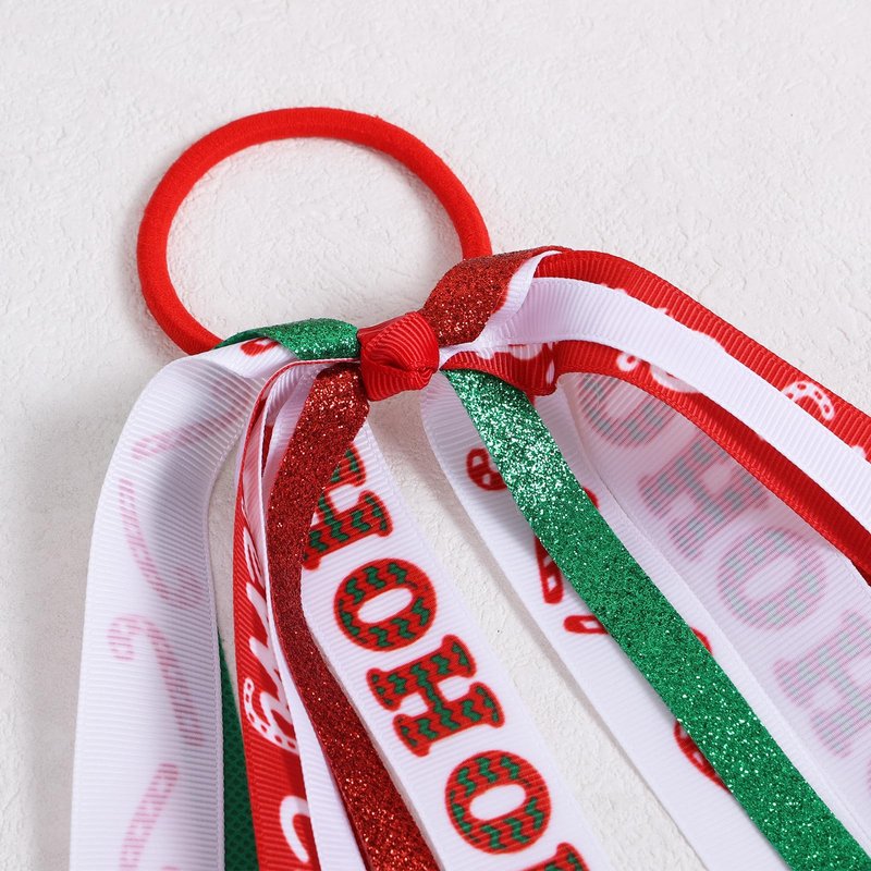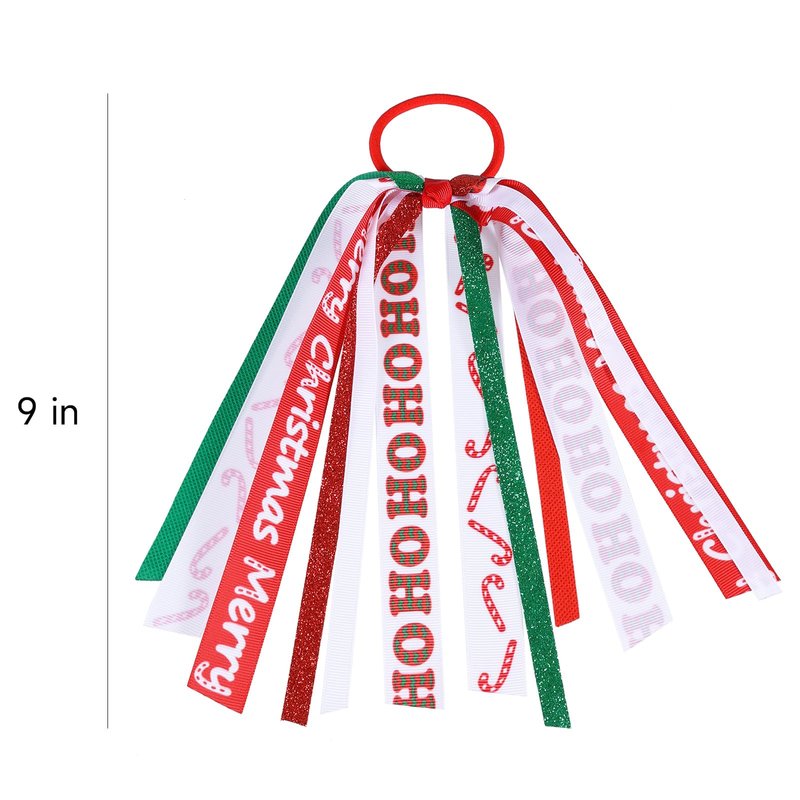 Christmas HOHO Ribbon Decor Ponytail Hair Streamer Girls Elastic Hair Tie Bands Handmade Pigtail Pony Holder Stuff Teens Toddler Party Dress Outfit Accessory Xmas Gift