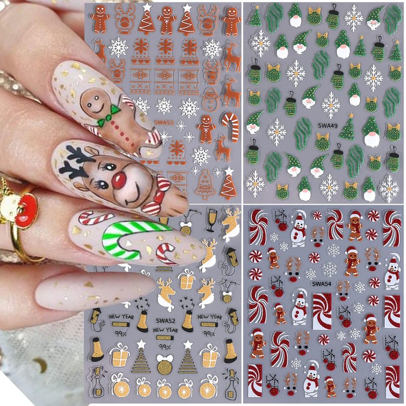 - Christmas Nail Art Stickers Set: You will get 4 sheets Christmas theme self-adhesive cute nail stickers, You can choose from different patterns to decorate your nails to create a variety of dazzling Christmas manicure designs. Can add a strong Christmas atmosphere.