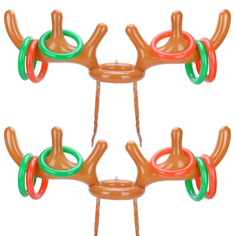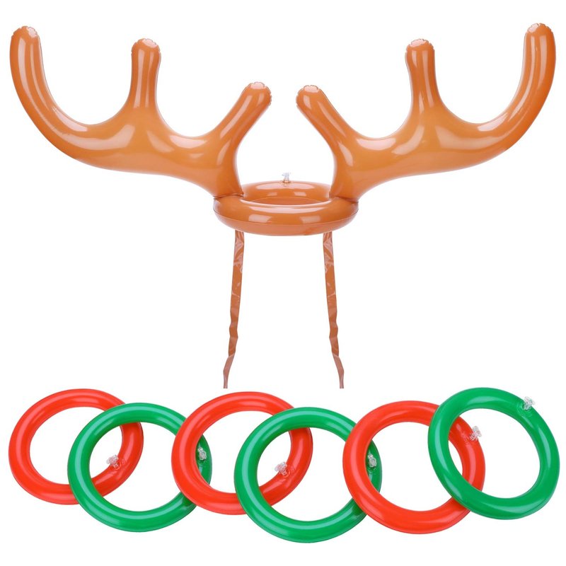 - 【CHRISTMAS TOSS GAME KIT】Super Valuable Reindeer Ring Toss Game. Pack include: 2 Inflatable Reindeer Antler Hats with chin Strap,easy to wear; 12pcs Large Inflatable Rings(6pcs red+6pcs green).Highly recommended that blow directly with your mouth!!!just throw the rings to catch the Reindeer !