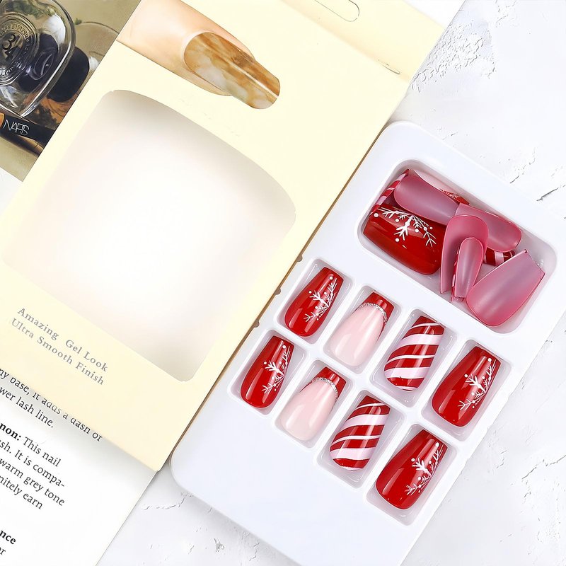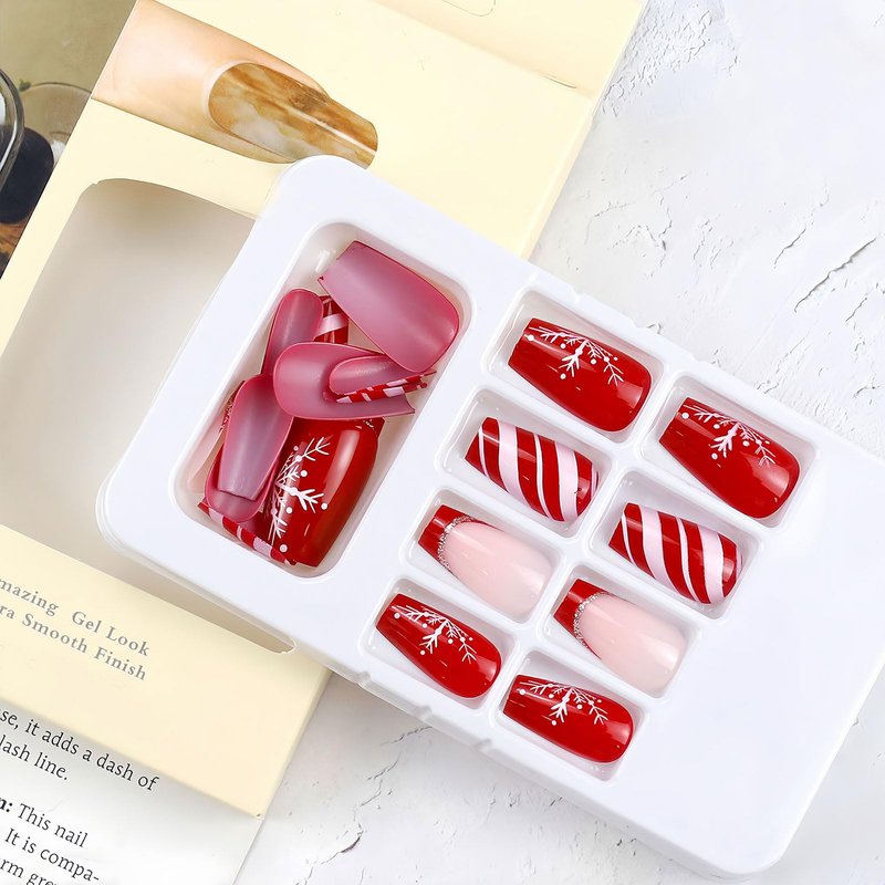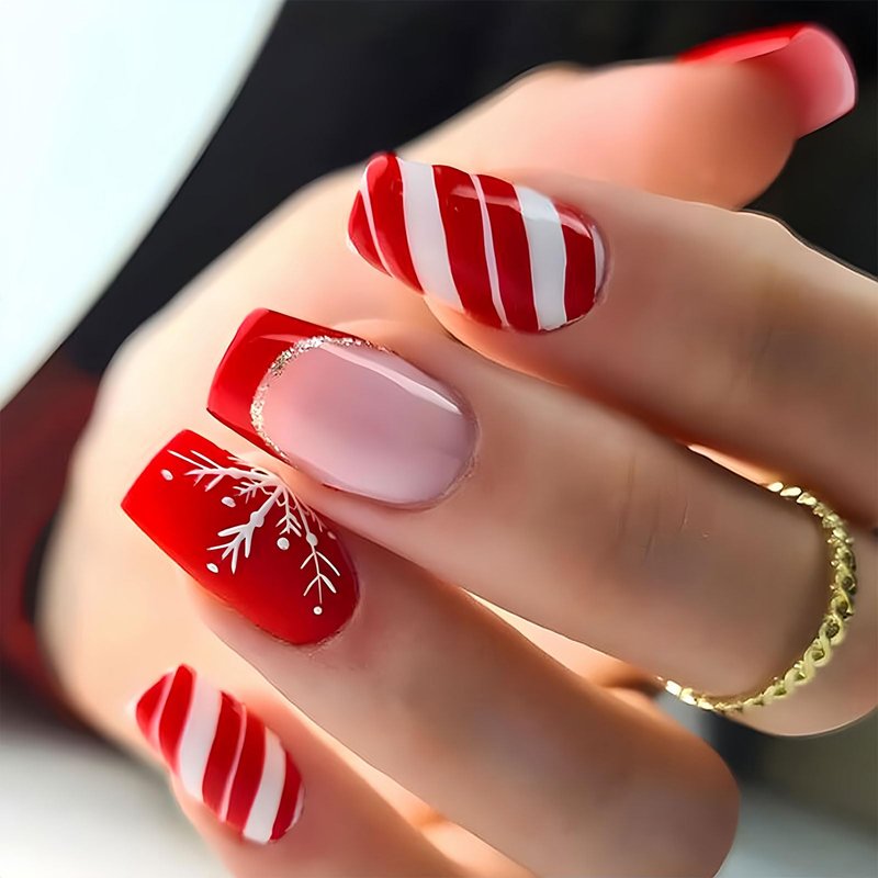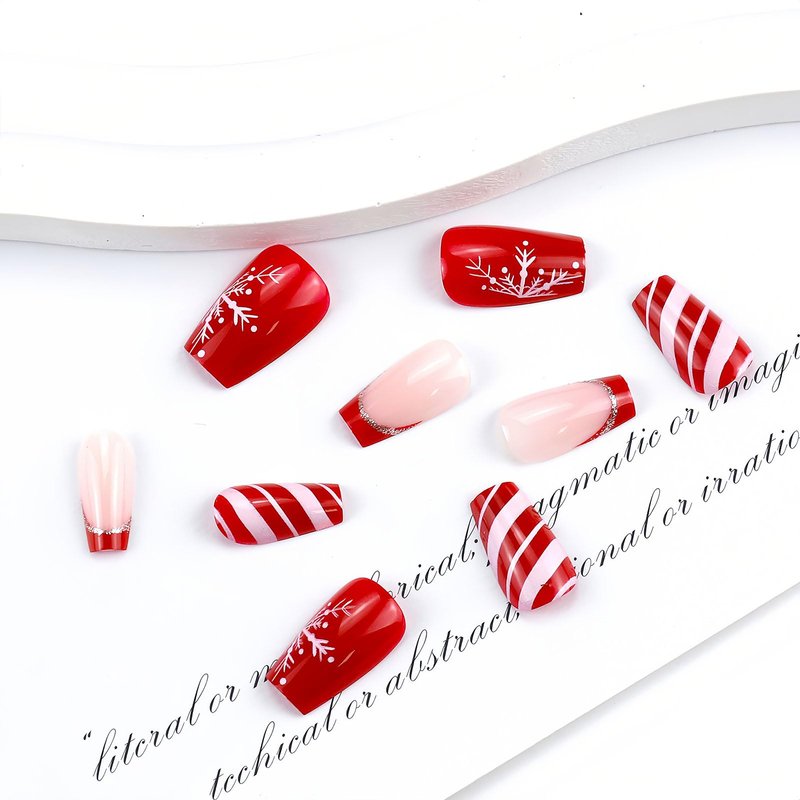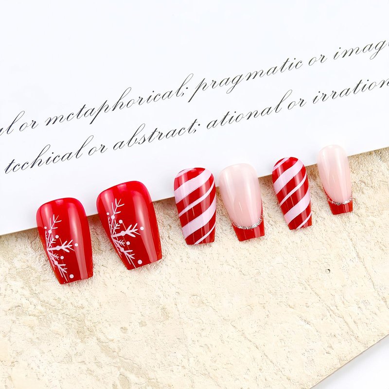 - Festive Christmas Design: Featuring red French tips with a red and pink base, adorned with white snowflakes and red-and-white candy cane swirl patterns. The design captures the essence of Christmas, perfect for holiday gatherings or everyday wear