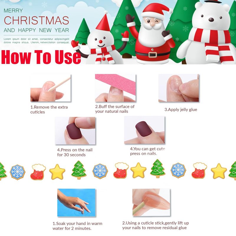 - Easy to use: Just choose the nail piece that suits you, polish the nail bed, paste the jelly glue we give you, and then press the nail for 30 seconds to get your favorite Christmas style nail. Due to the limited use of jelly glue, we suggest you use your own glue