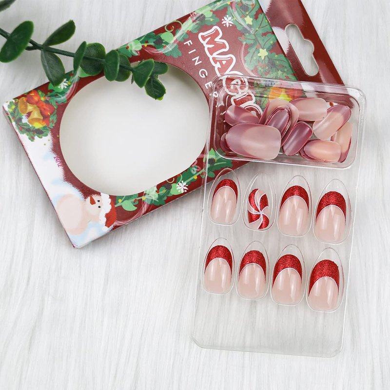- 【🎄Package Contains】 24 pieces of short medium length fake nails with adhesive tape and one nail file in a transparent little box size is 5.5x 2.7 inches.