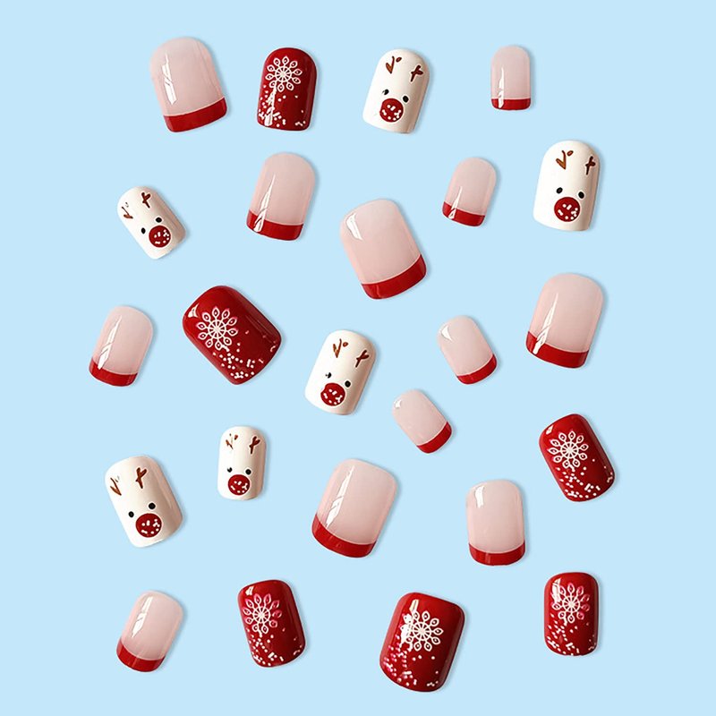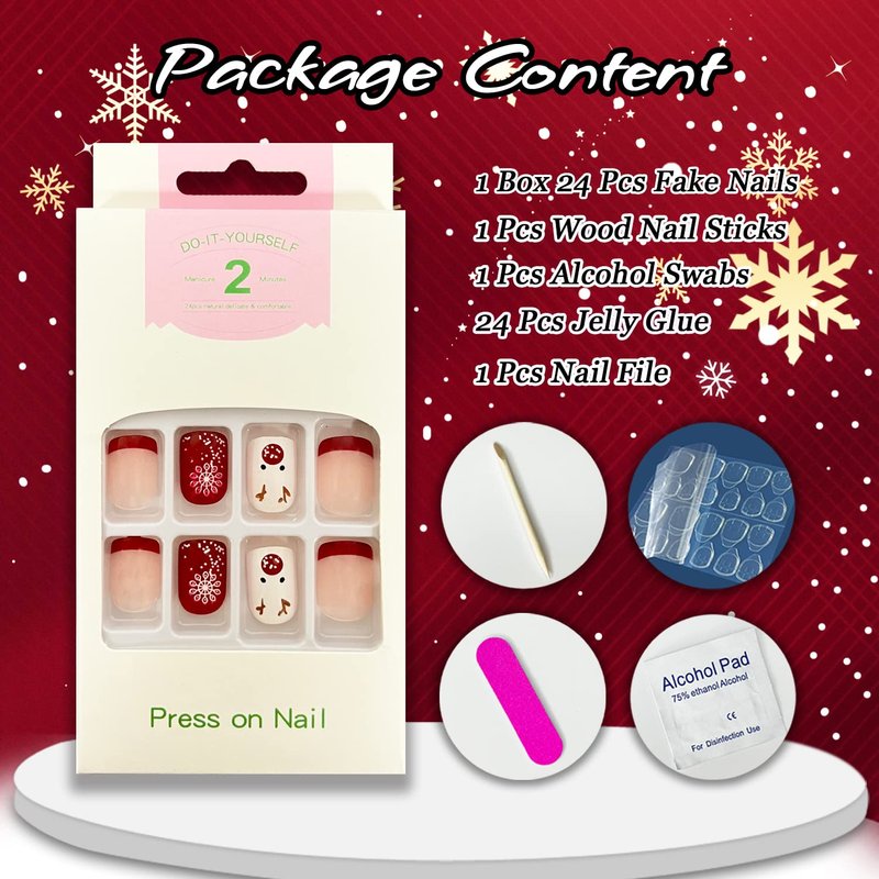 - 🎄【Package Contains】:24 Pcs Christmas short false nails, 24 pieces of jelly glue, 1 piece of alcohol cotton, 1 mini nail file, 1 wooden stick.