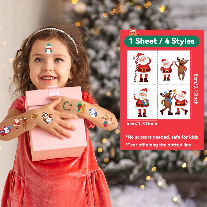 • [Christmas Decorations Tattoos]: Christmas tattoos temporary include santa claus, christmas tree, reindeer, snowman, penguin etc. classic Christmas pattern. Christmas tattoo stickers for kids are not just for skin–they’re perfect for decorating various smooth surfaces. Kids can stick them on glass cups, stationery, gift boxes etc.
