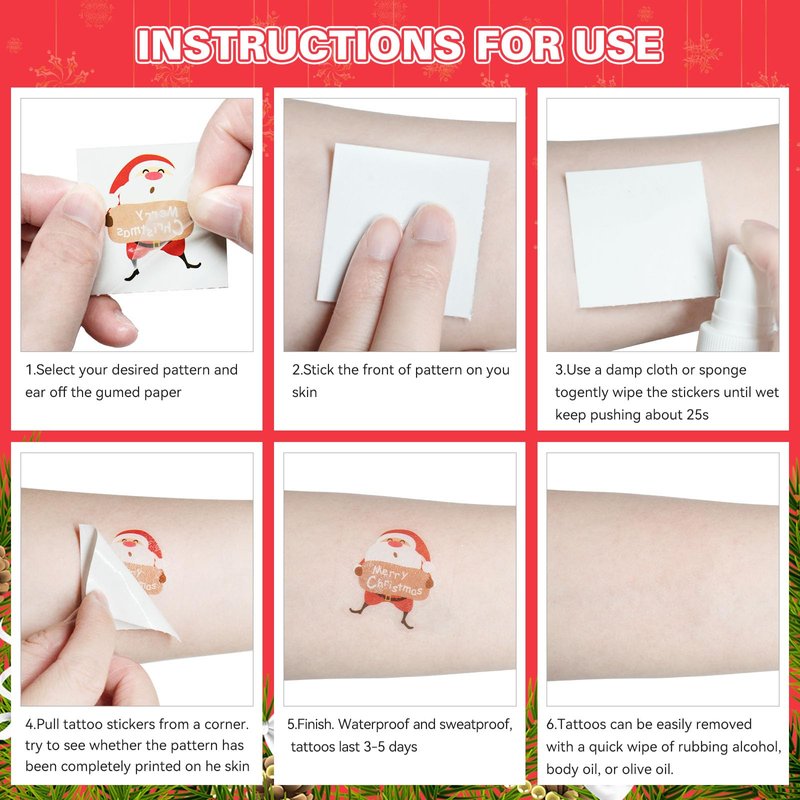 • [Easy to Use]: Simply choose your favorite xmas tattoos, place it face down on the skin, and wet it with water. Wait for 20 seconds, then gently remove the white surface to reveal the tattoo. When it’s time to clean up, a quick wipe with alcohol, body oil, or olive oil easily removes the tattoos. Not recommended for kids with extremely sensitive skin.