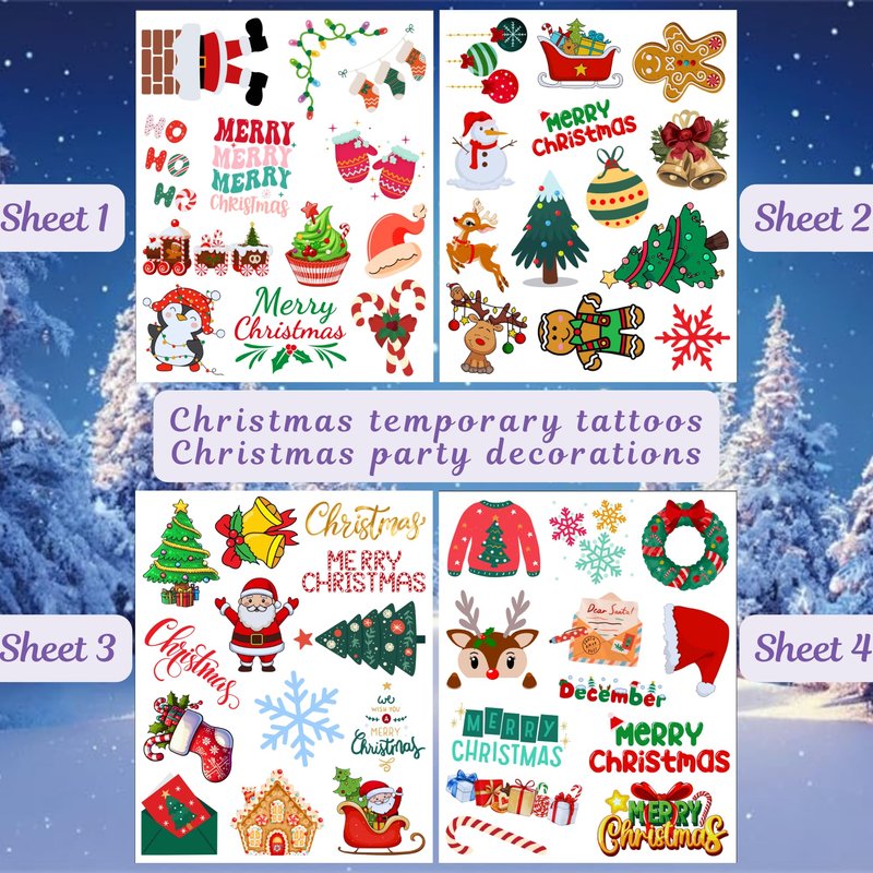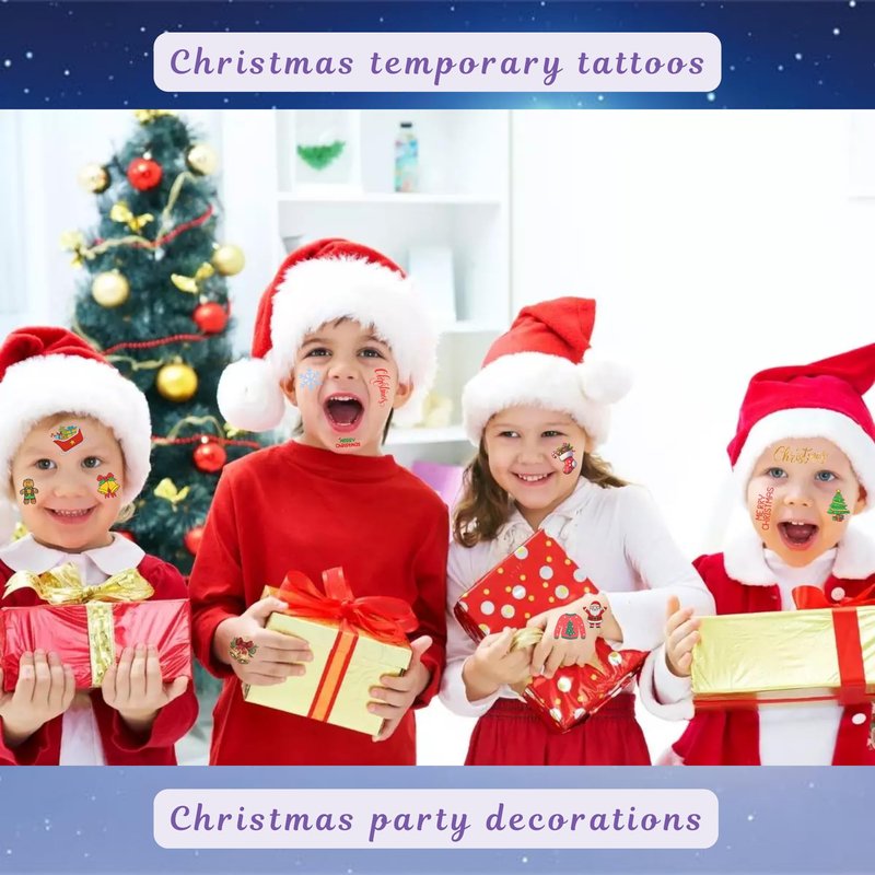 Featuring festive motifs such as Santa Claus, reindeer, Christmas trees, and snowflakes, these tattoos bring holiday cheer to any celebration. Simply apply with water in seconds, making them a convenient accessory for holiday parties and family gatherings.