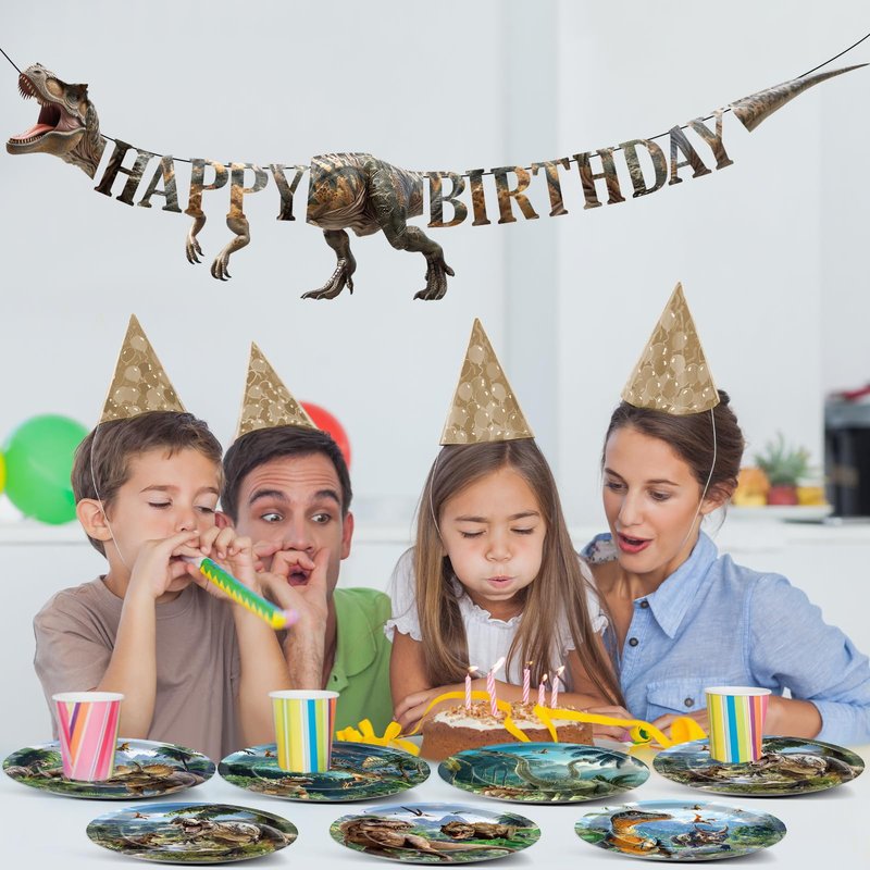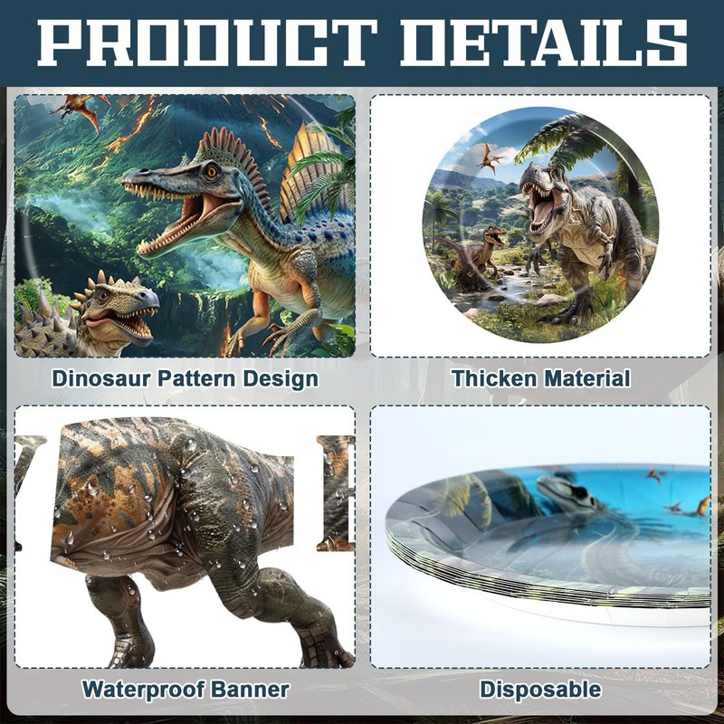 - Dinosaurs design:Feast your eyes on six different dinosaur species showcased on these tropical jungle disposable plates, each with a unique scene. The realistic T-rex design “HAPPY BIRTHDAY” banner featured a movable jaw, hands, and leg which will make your birthday party fun.