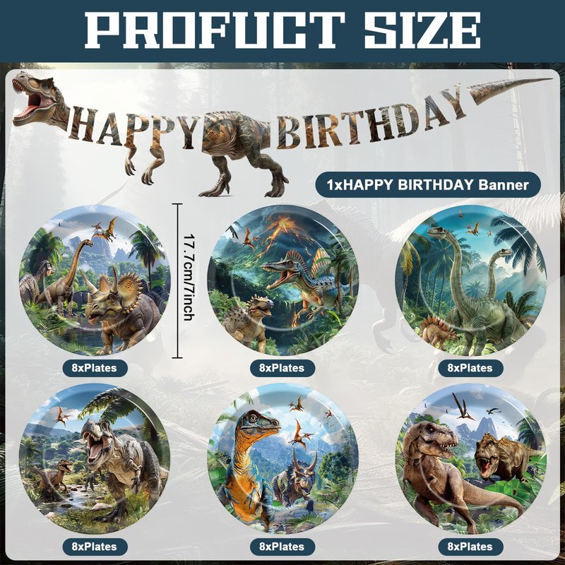 - Package includes: You will receive 1 pc 70x17inch dinosaur party banner and of 48 pieces of 7inch paper plates in four different styles, 6 pieces each which enough to meet your needs of using and sharing. Adding a pleasant atmosphere to welcome the dinosaur theme party.