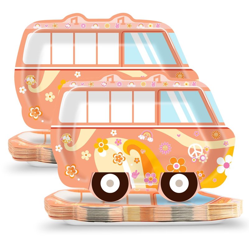 Each plate is crafted in the shape of a retro hippie bus, complete with whimsical daisies and classic peace signs. This distinctive design sets the stage for a themed party like no other, where every detail reflects the vibrant culture and ideals of the hippie movement.