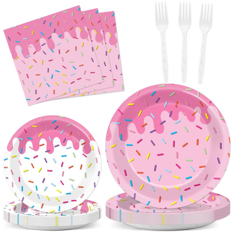 - Package includes: You'll get 24 pieces of 9in donut party paper dinner plates, 24 pieces of 7in sweet donut dessert plates, 24 pieces of pink donut party napkins of 6.5in, and 24 pieces of plastic white forks for each set that can serve 24 guests, creating a visually stunning table decor for your birthday party and events.