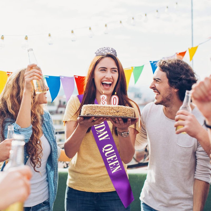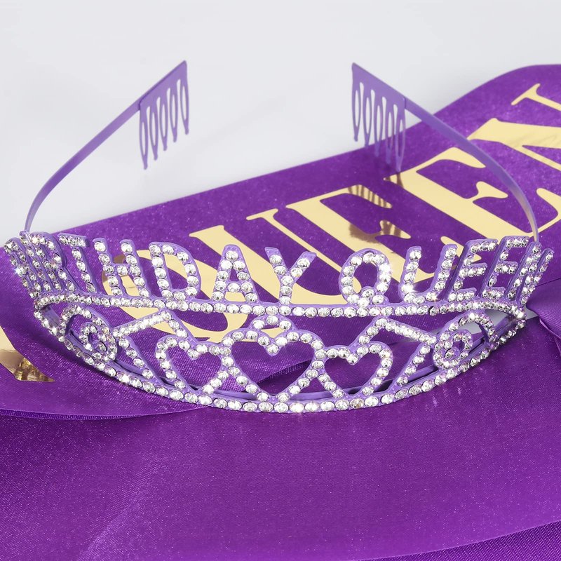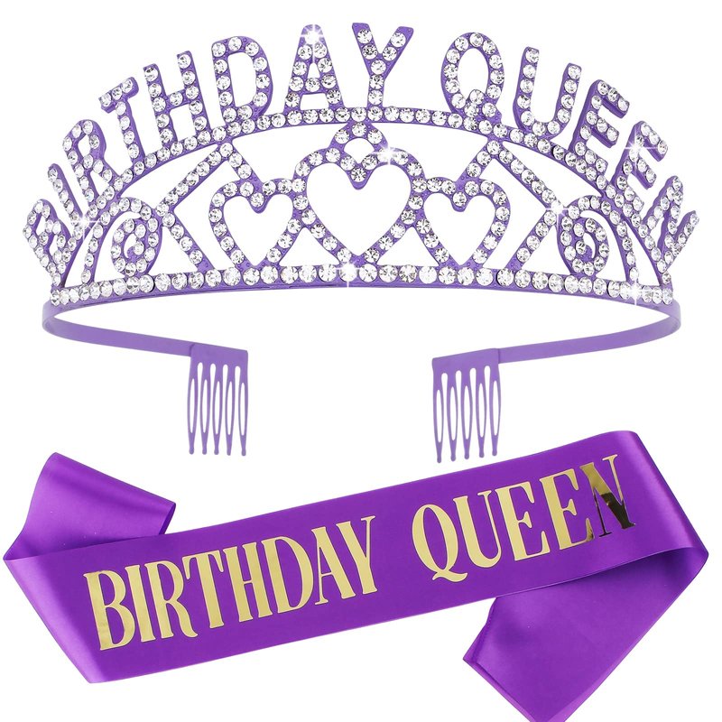 - The Perfect Purple Birthday Decorations Set: purple "BIRTHDAY QUEEN" sash + rhinestone purple birthday crown.