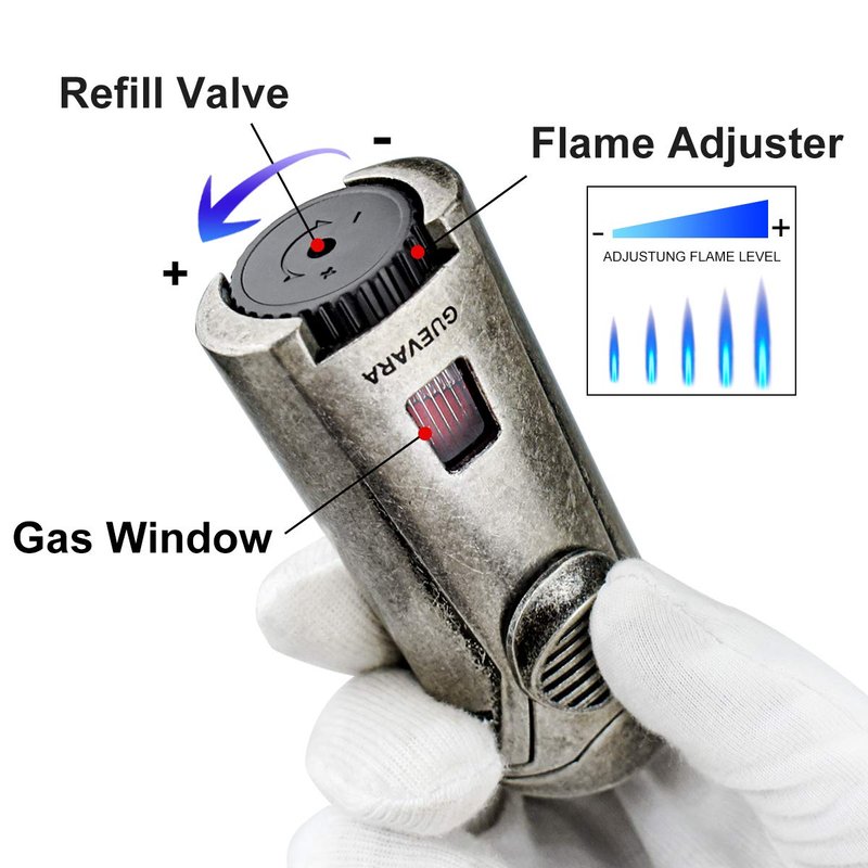 - High Quality :Top Quality Sturdy Metal Body,Single Flame Torch Lighter with Fuel Level Window, universal Refill Valve.
