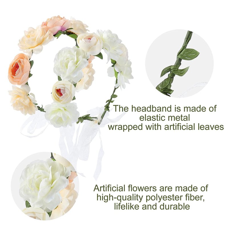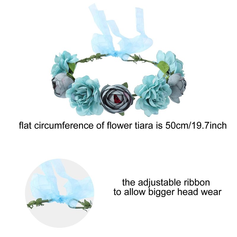- 【ONE SIZE】--You can see the original circumference (approx 50cm/19.7") of the flower wreath in the photo on the left, but they can fit for most both women and girls because there are two ribbons on the back to adjust the size. There is no need to worry about size problem.