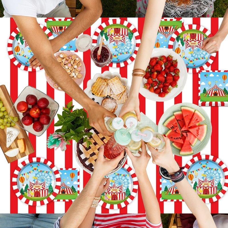 - Convenient:The carnival party tableware set is very convenient and easy to clean.These paper plates, napkins and tablecloths are disposable so you can clean up easily and save time. Perfect for birthday party.