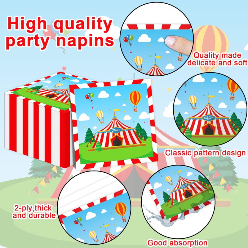 - What you will get: Our circus party supplies include a total of 41 pieces of disposable tableware. You will get 20×7 Inch plates, 20×napkins, 1×table cloth. Great for circus party and birthday party.