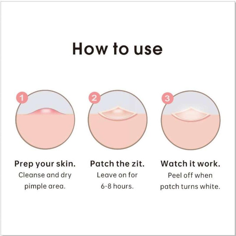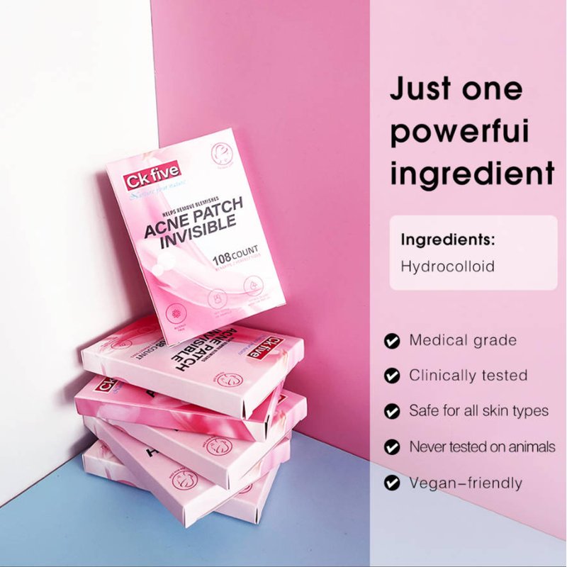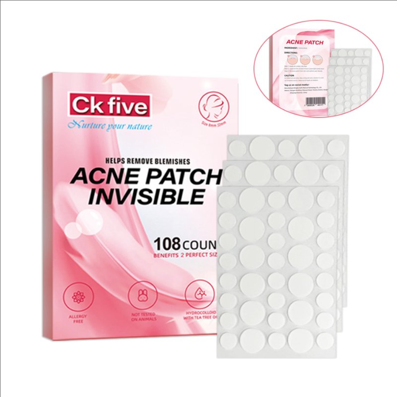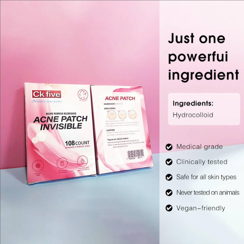 CK Five Acne Pimple Patches-A revolutionary skincare spot pimple patches.Our Hydrocolloid Acne Patch is a proactive and invisible acne treatment that effectively targets pimples,blemishes and zits for clearer face and skin. This pack includes 108 high-quality pimple patches for your convenience. Start by targeted area and allow the skin to dry completely. This ensures a clean surface for the patch to adhere to, maximize its effectiveness.Apply the Patch: Gently peel off the patch from the protective film and carefully place it over the blemish or zit. Lightly press down on the patch for 3-5 seconds to secure it in place.Wait for Results: Leave the patch on for a minimum of 4-8 hours or until you notice it has turned white. This indicates that the hydrocolloid technology is actively absorbing impurities, promoting faster healing.