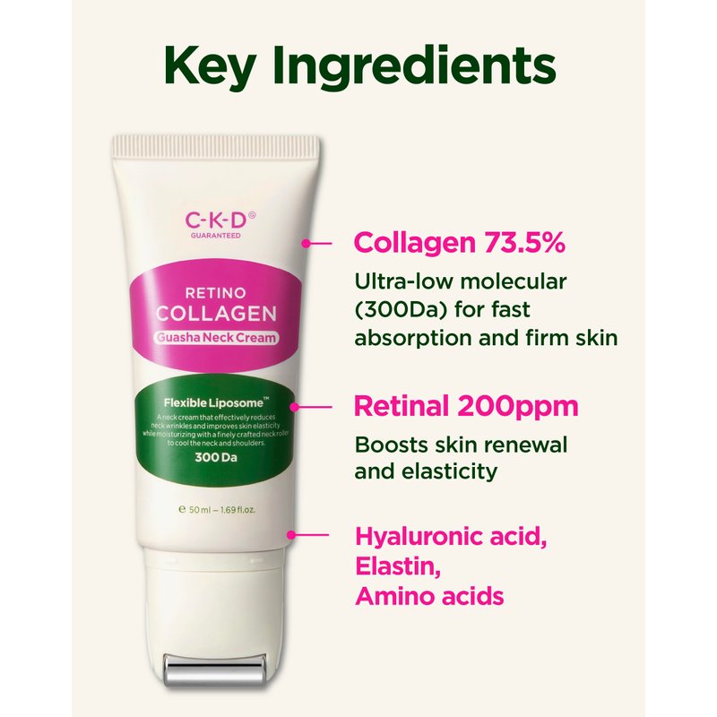 - LIFTING NECK CREAM WITH COLLAGEN & RETINOL: CKD Guasha Neck Cream targets neck wrinkles and sagging skin with small molecular collagen and retinol, boosting elasticity and promoting a firmer, youthful-looking neck and jawline while improving skin texture.