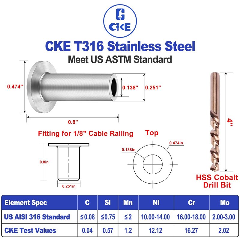 - 🔦Material: Made of T316 marine-grade stainless steel. High tensile strength and anti-fatigue strength Weatherproof. 【CKE Cable Railing Promised】All of CKE T316 Cable Railing will not rust in normal using situation even after installed 10 years, if not, we will offer warranty with full refund.