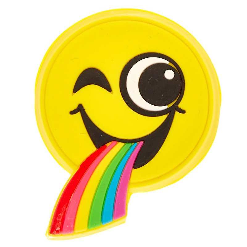 - Strawberry flavored lip gloss comes inside a container shaped like a rainbow vomit face.