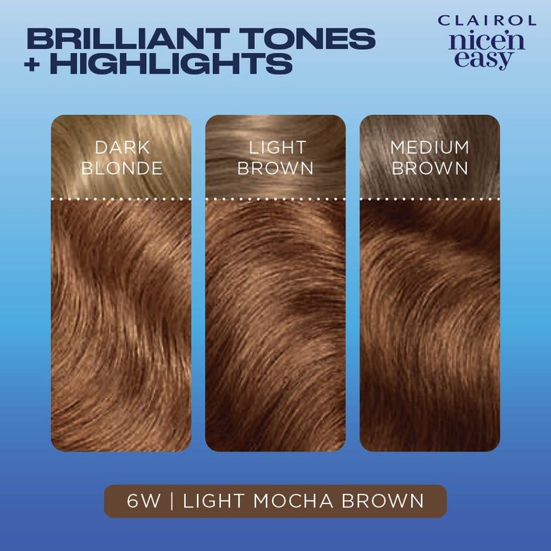 - Get permanent, silky, natural-looking hair color with Clairol Nice'n Easy 6W Light Mocha Brown. Creates 3 salon tones and highlights in 1 simple step using Color Blend technology