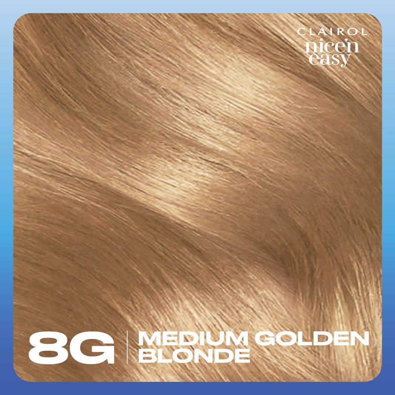 - Clairol Nice'n Easy 8G Medium Golden Blonde. Permanent natural looking color with 100% gray coverage.