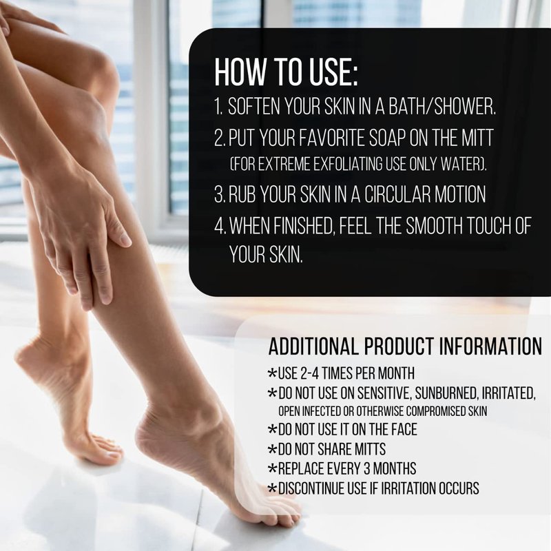 - How to Use: Steam or soak yourself in a tub with warm water for few minutes; Dampen your gloves and test if the skin is ready to exfoliate; In a circular motion, use mitt back and forth strokes and exfoliate one section at a time; Try to add pressure until you comfortably get the exfoliation needed; Finish with a cleanser and moisturizer