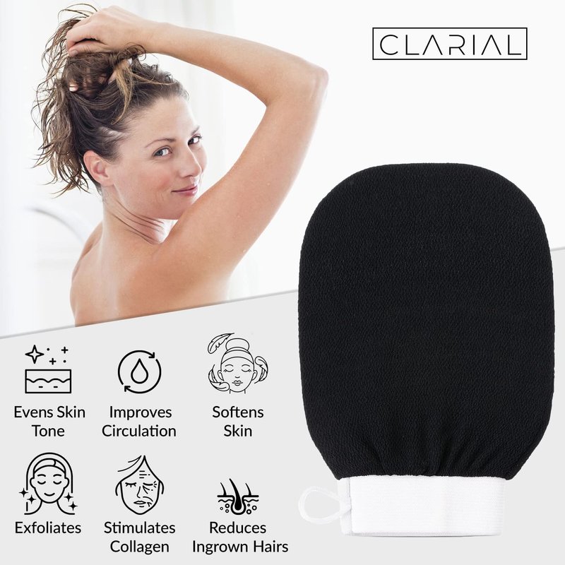 Clarial Exfoliating Body Scrub for Bath & Shower Use - Face Scrubber & Body Exfoliator for Dead Skin Remover - Korean Exfoliating Glove Shower Scrub for Men and Women - Pair Black