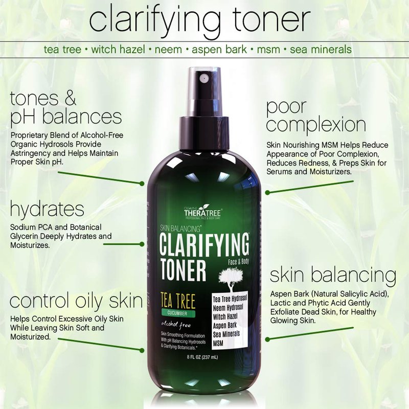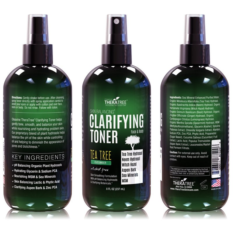 Oleavine TheraTree Natural Clarifying Toner Spray helps gently tone, smooth, and balance your skin while nourishing and hydrating problem skin. Our natural proprietary blend of organic plant hydrosols helps ph balance the skin while controlling oil and helping to diminish the appearance of pore size and blotchiness.Great for oily and poor complexion skin. Use before your favorite anti-aging serum or daily moisturizer for optimum hydration. Great for both body care and facial complexion while acting as a skin balancing toner for daily use. Key moisturizing ingredients Sodium PCA and Kosher Glycerin help hydrate dry skin and control red blotchy skin.Organic hydrosols include astringent witch hazel, tea tree, and neem leaf to helps reduce the appearance of pore size.