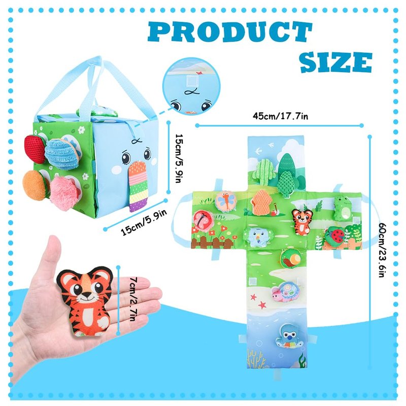 - 【MULTI-FUNCTIONAL SENSORY CUBE TOY】This toy can be pieced together into a cube or played matching games on the ground. With different activities on each side, your baby will be endlessly entertained. The 12-piece sensory textured animal bean bags includes (elephant, tiger, octopus, turtle...) using different pleated sounds, BB squeaker and bells to stimulate the baby's curiosity.