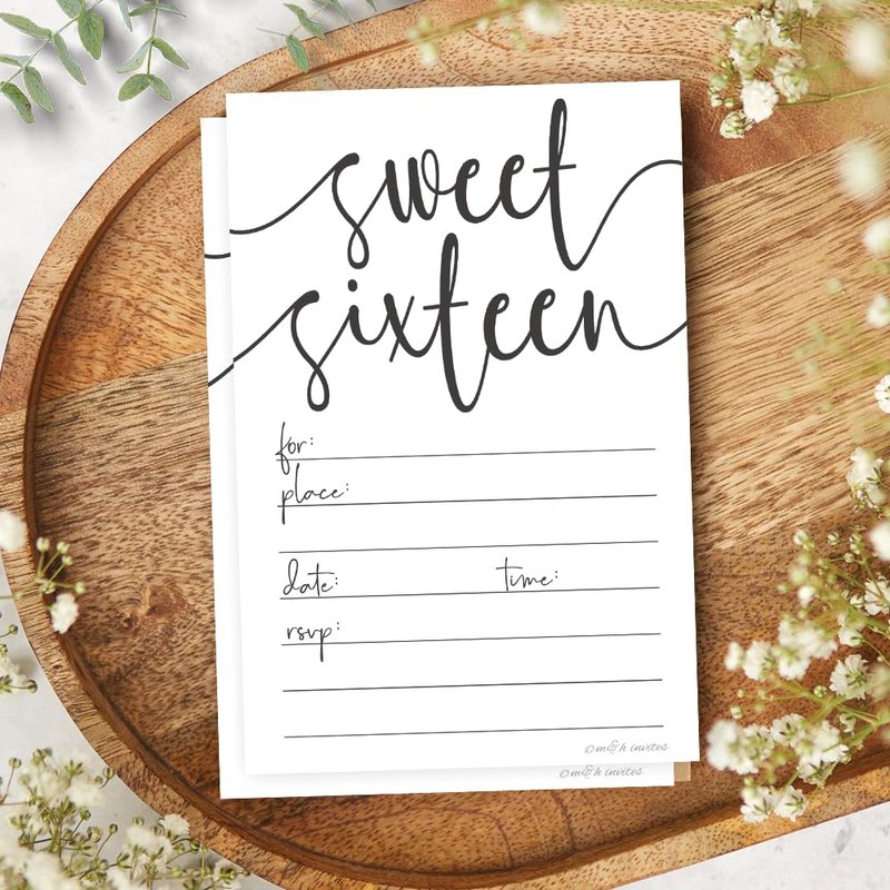 Welcome your guests to your sweet 16 party celebration with these classic black and white invitations by m&h invites. Includes 20 Envelopes. Invites measure 4" x 6”. Heavy-weight matte card stock for easy fill in with many pen types.