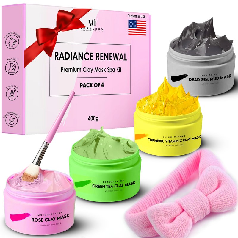 Clay Mask Pack of 4 Jars (400g) With Cute Headband & Brush | Clay Face Mask Gift Pack | Turmeric Vitamin C Clay Mask For Face Green Tea, Rose, Dead Sea Mud | Womens Christmas Gifts, Gift set for Women