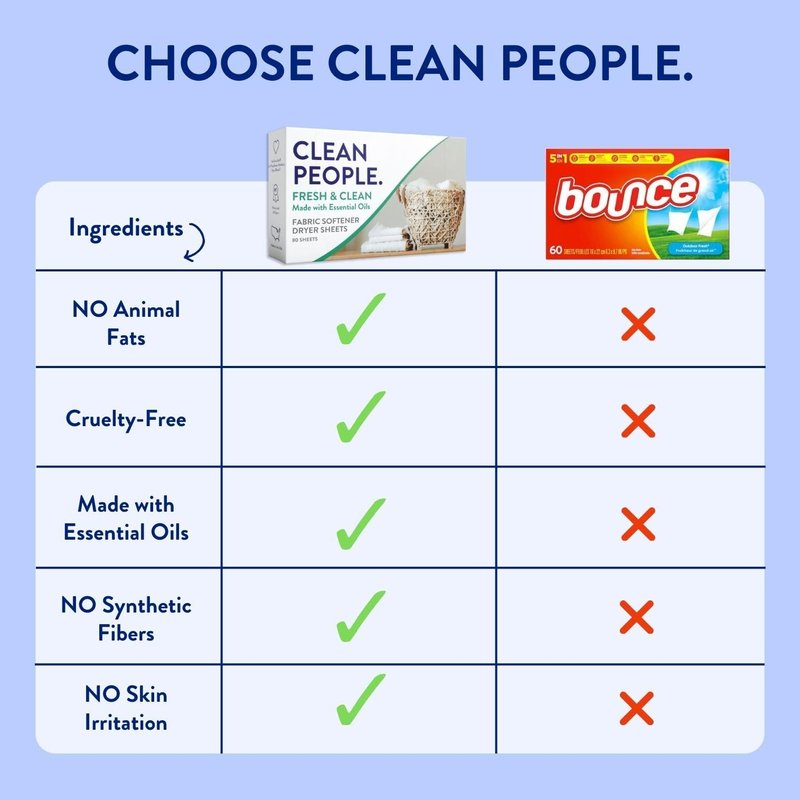 - MADE WITH ESSENTIAL OILS: Unlike others, our dryer sheets are not scented with synthetic fragrances but with all natural essential oils. 160 Sheets of Clean People Fabric Softener with a great Fresh Scent. Thats 160 soft & static free loads!