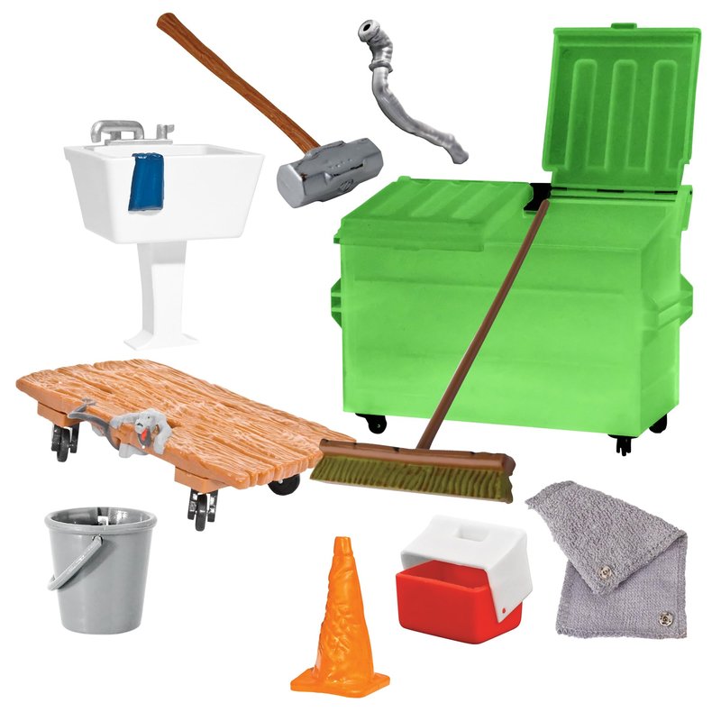 - Also included are a towel, push broom, traffic cone, sink, cooler and bucket, providing everything needed to restore order after the chaos.