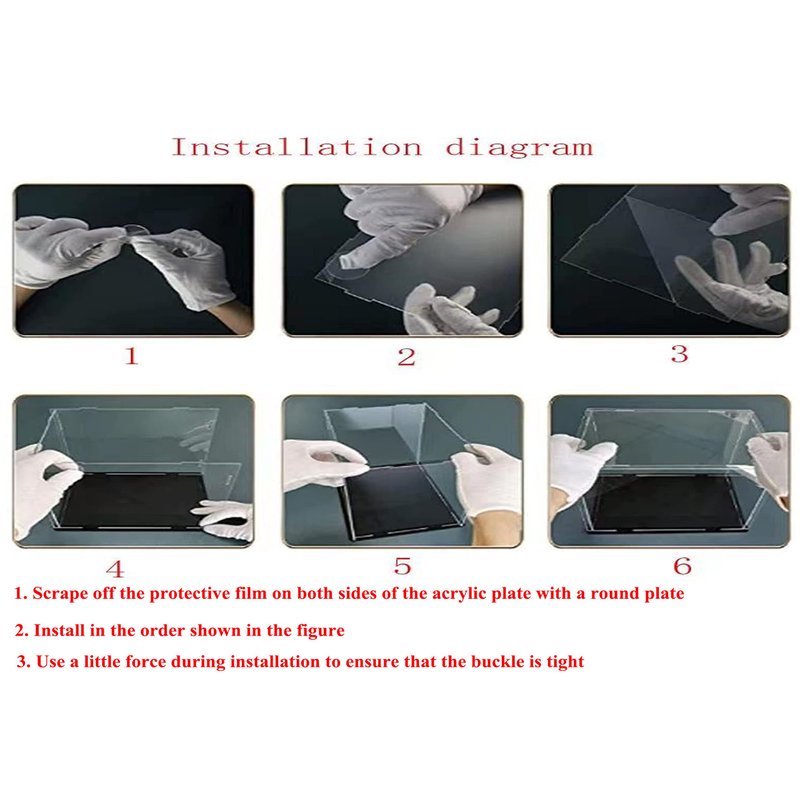 Convenient installation: first use a small round piece to gently scratch the protective film on the corner of the acrylic plate, and then slowly tear off the protective film by hand. Note: there is a protective film on both sides of the acrylic transparent plate. After the protective film is torn off, the acrylic plate will be very transparent. Assemble according to the steps shown in the figure, and insert the interface tightly, so that you can get a perfect display box. (Installation instructions are included in the product package)