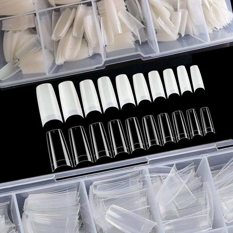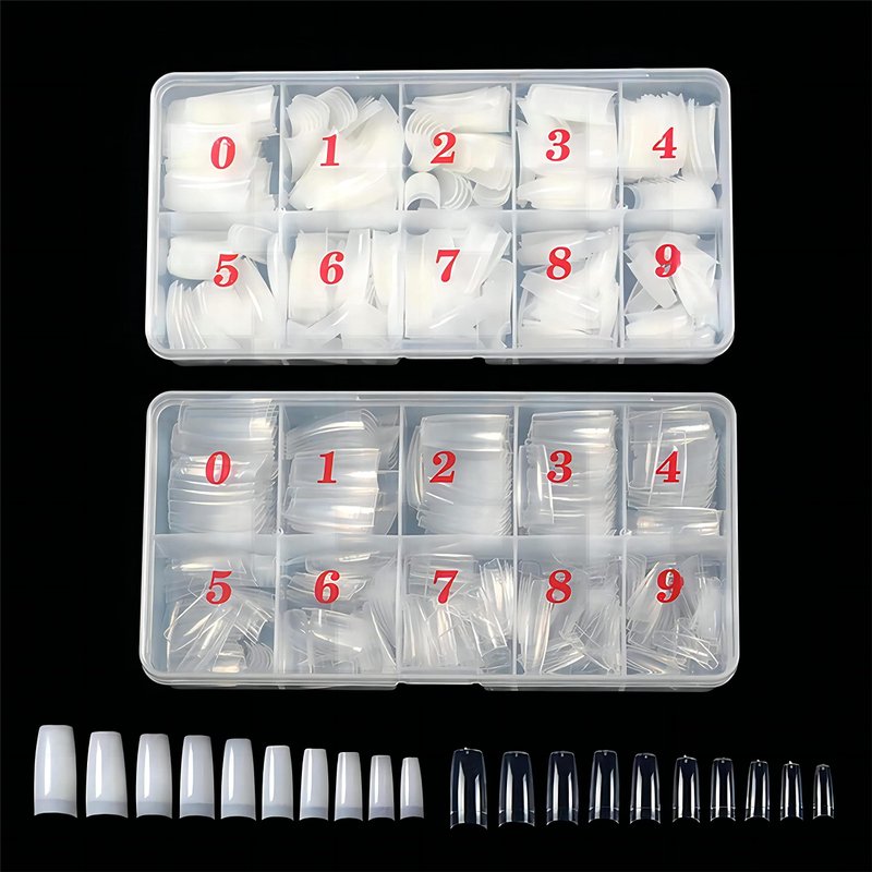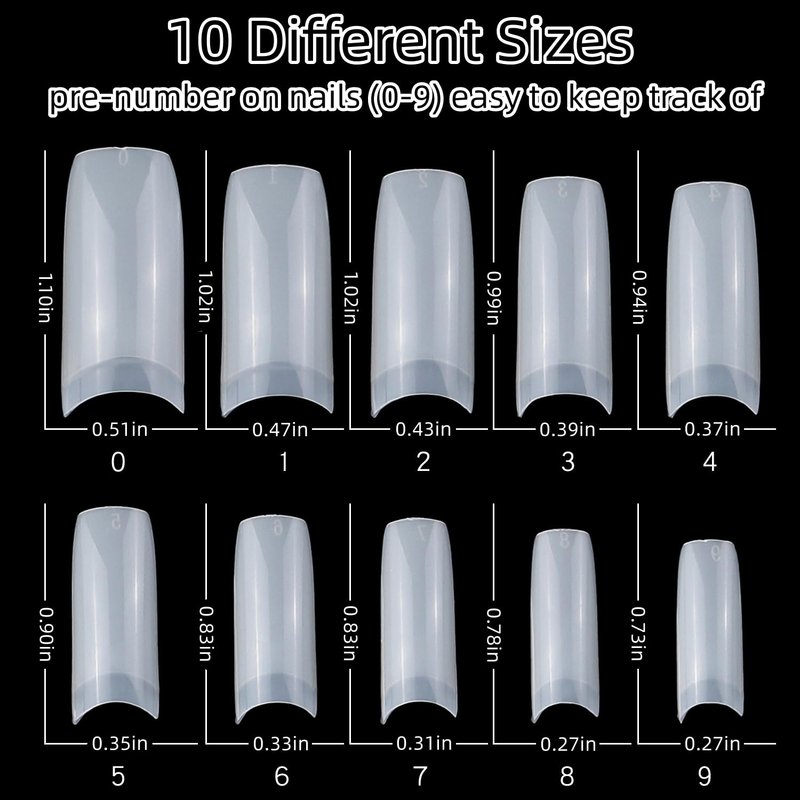 - 1000PCS half cover nail tips offer 2 Colors(Clear and Natural)10 different sizes with 50 nails,which is pre-numbered 0-9.So they're easy to keep track of, and convenient to choose the suitable size that fits your every finger