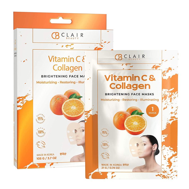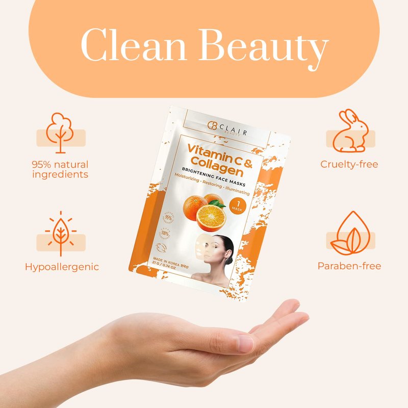 Clear Beauty Vitamin C and Collagen Sheet Face Mask - Diminishes Fine Lines & Wrinkles, Lifts & Hydrates Skin, Brightening Sheet Mask - Cruelty Free Korean Skin Care For All Skin Types