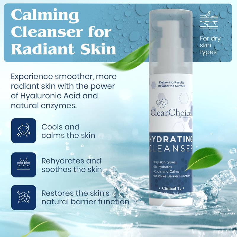 Experience the ultimate care for your sensitive skin with Clear Choice Hydrating Cleanser. This rich, creamy cleanser is specially designed for delicate, rosacea-prone, and dry skin types. Formulated with powerful yet gentle ingredients like Azulene, Hyaluronic Acid, and Vitamins B and E, it effectively cleanses while preserving your skin’s natural moisture barrier.