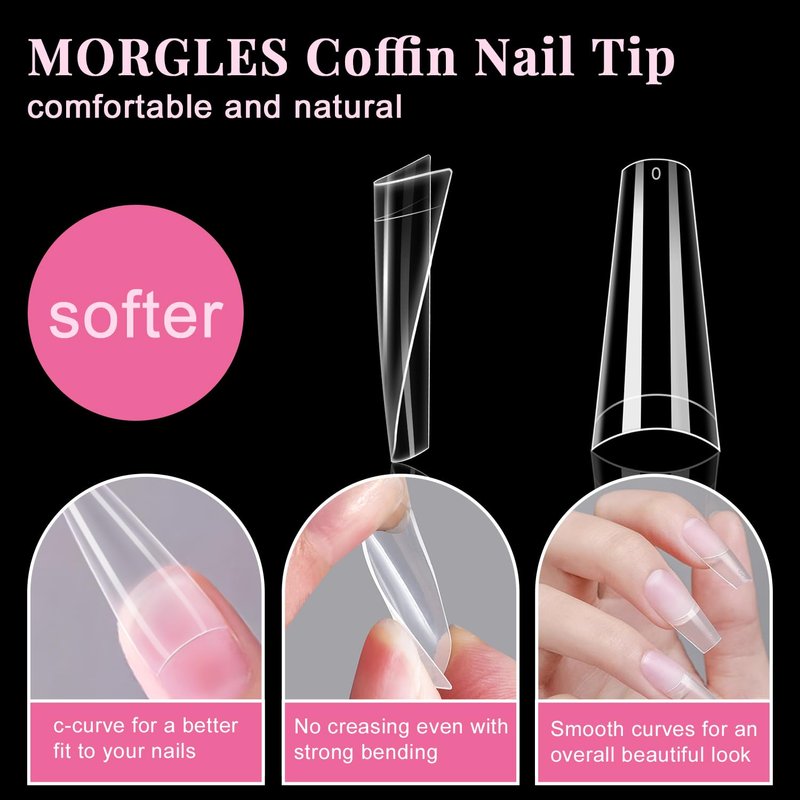 Clear Coffin Nail Tips Set, MORGLES 500pcs Long Nail Tips for Acrylic Nails Professional Half Cover Ballerina French Nail Tips Fake Nails Kit with Nail Glue, Clipper, Files, Cuticle Pusher and Fork