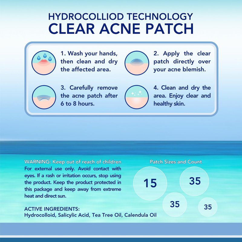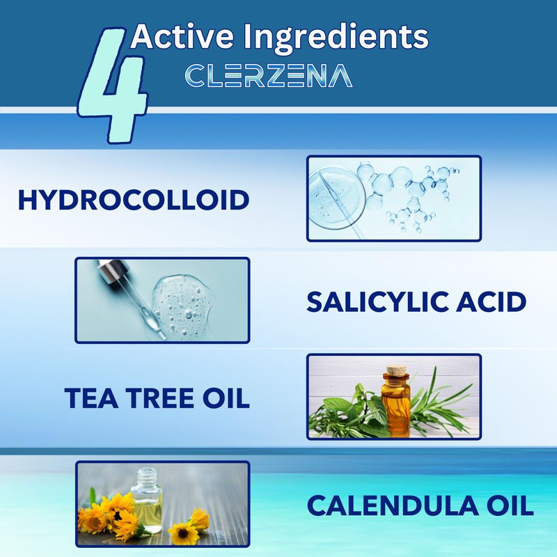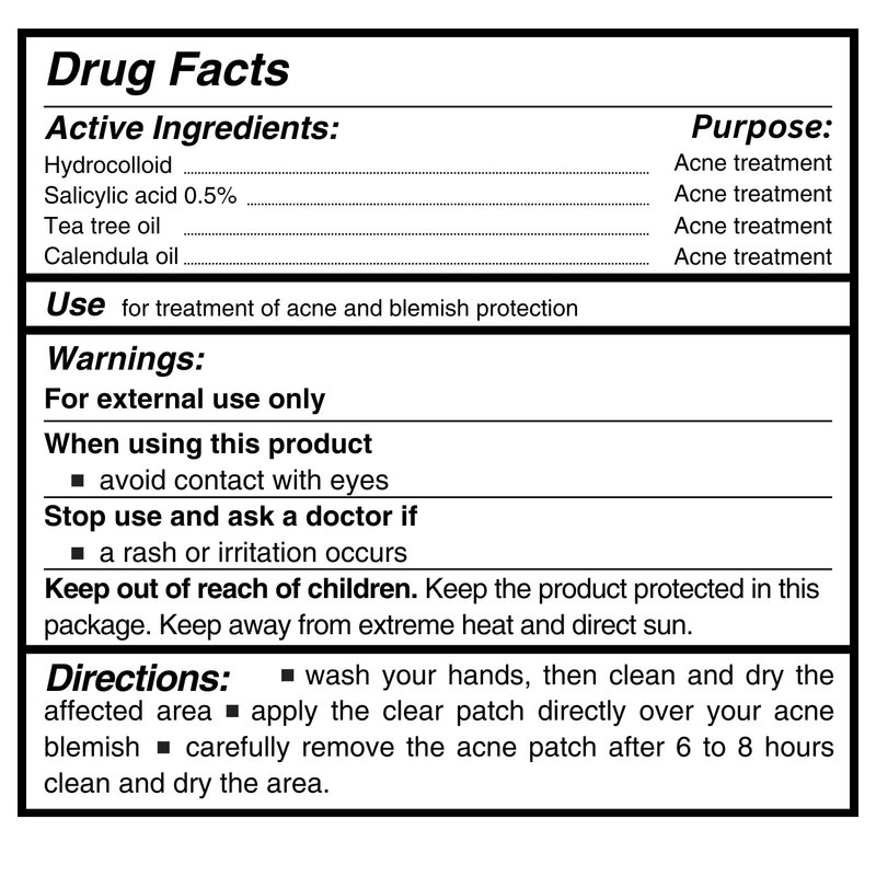 - Four Ingredient Acne Patch - Hydrocolloid acne patches and salicylic acid pimple patches. Zit patches for acne are tea tree pimple patches, salicylic acid patch and have calendula oil for acne treatment. The salicylic acid patches with added ingredients promote a protective blemish environment. It is a quality hydrocolloid bandage with three added ingredients.