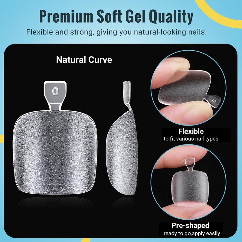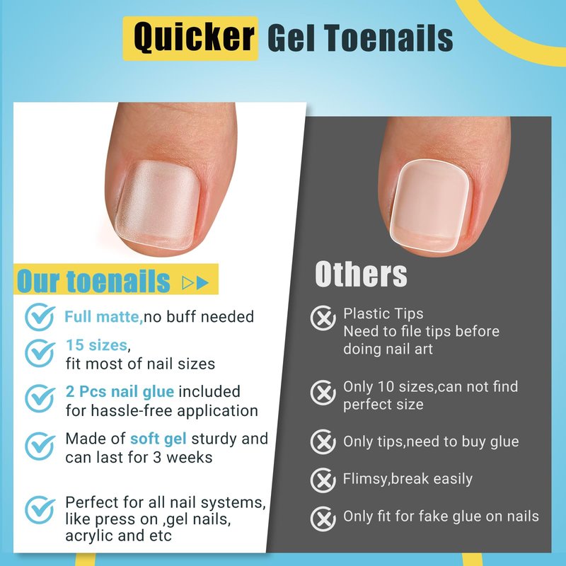 - FULL COVER GEL TOE NAILS: These no-file matte clear press on toenails are made of soak-off gelly tips,pre-shaped and ready to go, providing you with a natural-looking, lightweight, easy-to-apply, time-saving alternative compared to traditional nail enhancements. Specifically designed to last up to 3 weeks without any lifting or chipping