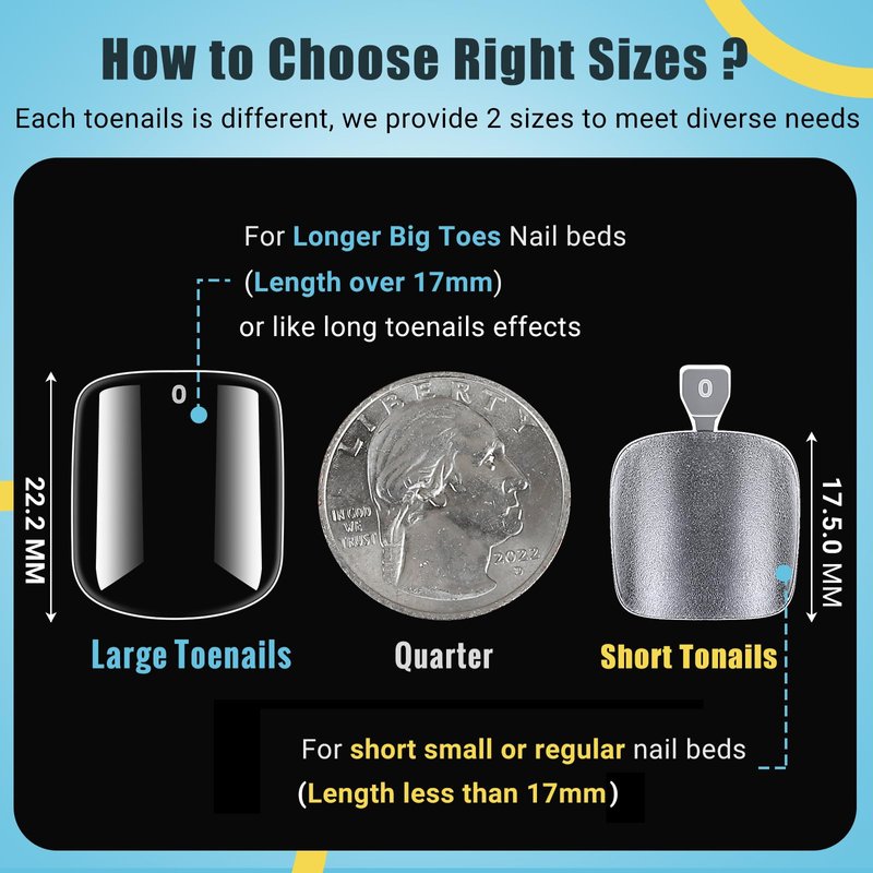 When it comes to fake toenails, people reflect acrylic glue on flimsy nails,sinokame finally develop 2 sizes range for different toenail beds need, one is medium for small normal size toenails, and the other is long wide width, for people who have large big toenails.