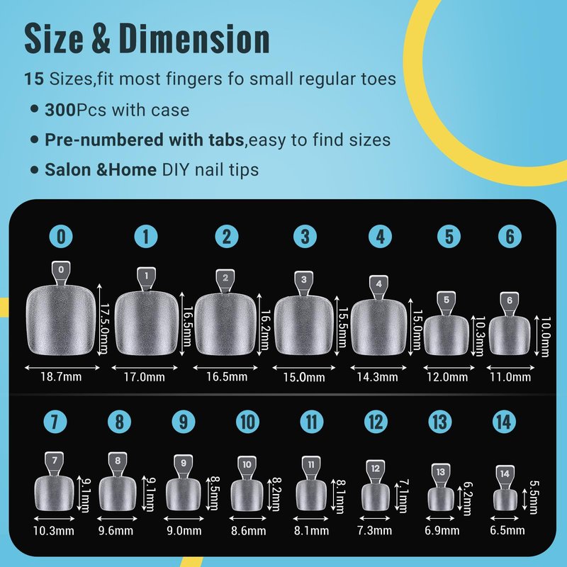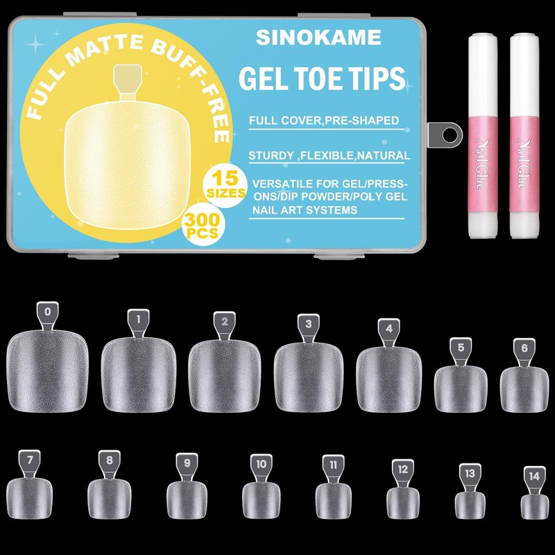 - INSTANT 2 in 1 PEDICURE KIT: Achieve salon-like pedicures effortlessly with our false toenails kit with glue. This gel acrylic toenail kit includes 300 Pcs clear pre-buff nails in 15 sizes, along with 2 strong nail glue。 With this kit, you have everything you need for stunning pedicures at home